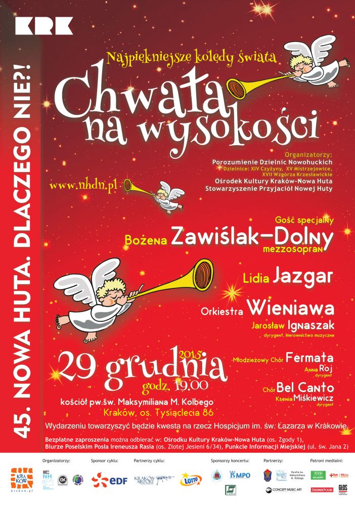 45 koncert z cyklu Nowa Huta. Dlaczego Nie?! odbędzie się 29 grudnia br. o godz. 19.00 w Koœciele p.w. œw. Maksymiliana M. Kolbego (Kraków, os. Tysišclecia 86). Podczas koncertu usłyszeć będzie można kolędy z różnych stron œwiata w tradycyjnych i nowych aranżacjach, o które zadba Orkiestra Wieniawa pod dyrekcjš Jarosława Ignaszaka. Orkiestrze towarzyszyć będš Młodzieżowy Chór Fermata pod dyrekcjš Anny Roj oraz Chór Bel Canto prowadzony przez Ksenię Miœkiewicz. Goœciem specjalnym koncertu będzie mezzosopranistka Bożena Zawiœlak-Dolny, współpracujšca m.in. z Operš Krakowskš. Wraz z niš na scenie wystšpi Lidia Jazgar, która tradycyjnie poprowadzi również całoœć koncertu. W repertuarze koncertu znajdš się m.in. kolędy Z narodzenia Pana, Wœród nocnej ciszy czy Dzisiaj w Betlejem. Obok nich usłyszeć będzie można œwišteczne piosenki takie jak Where’s the line to see Jesus, Jinglle Bell rock czy White Christmas i wiele innych.