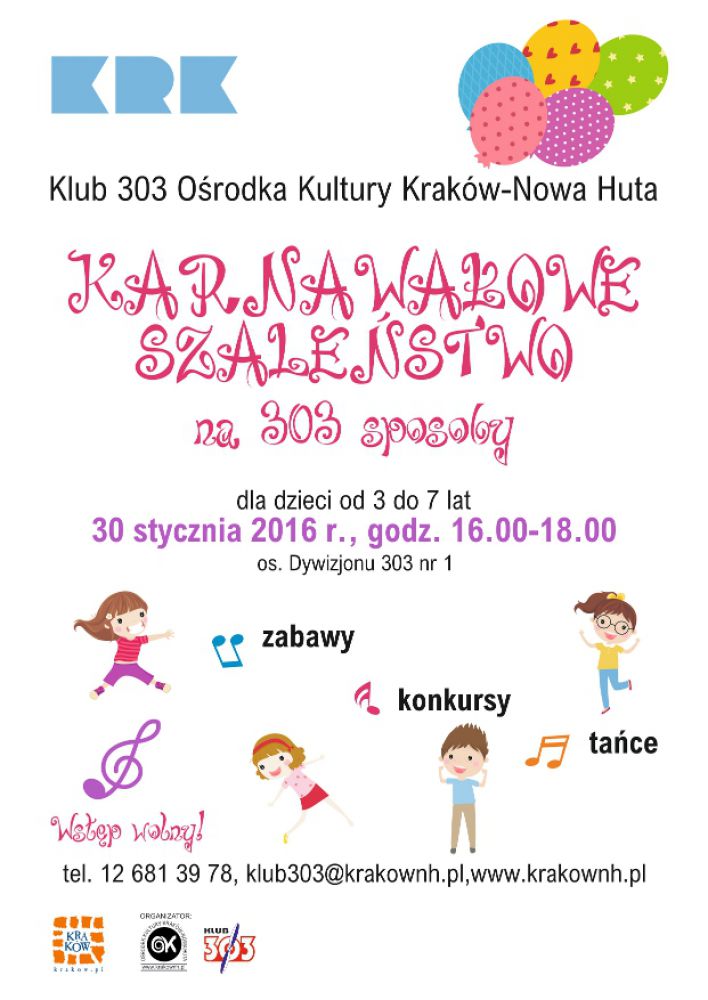 Zapraszamy do Klubu 303 Orodka Kultury Kraków-Nowa Huta (os. Dywizjonu 303 nr 1) na Karnawałowe szaleństwo. W radosnej i przyjaznej atmosferze dzieciaki będš miały okazję spędzić miło karnawałowy czas. W programie: zabawy, konkursy i tańce. Zapraszamy 30 stycznia br. na godz. 16.00.