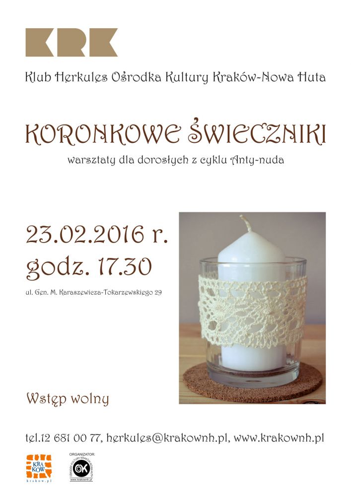 Klub Herkules Oœrodka Kultury Kraków-Nowa Huta (ul. Gen. M. Karaszewicza-Tokarzewskiego 29) zaprasza na kolejne warsztaty dla dorosłych z cyklu Anty-nuda, które odbędš się 23 lutego o godz. 17.30. Masz wolny czas? PrzyjdŸ do nas! Podczas warsztatów nauczymy się jak wykonać koronkowe œwieczniki, wykorzystujšc do tego serwetki. Warsztaty to wspaniała okazja aby wykonać samodzielnie wyjštkowš ozdobę do swojego domu.