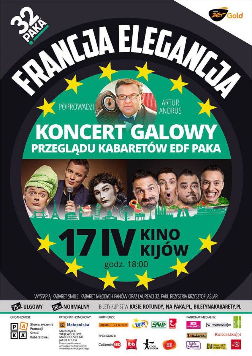 Paryski szyk na scenie Kina Kijów zaprezentujš, œwiętujšcy niedawno dziesięciolecie działalnoœci Kabaret Młodych Panów i bijšcy rekordy popularnoœci Kabaret Smile. Obok nich laureaci tegorocznej PAKI pokażš się w zwycięskich numerach i specjalnie przygotowanych na tę okazję skeczach. Pieczę nad całoœciš sprawować będzie Krzysztof Jaœlar –reżyser od lat zwišzany z PAKĽ, zaœ cały koncert poprowadzi znany ze stylu i klasy Artur Andrus. Serce œmiejšcej się Europy bije w Krakowie na PACE!
