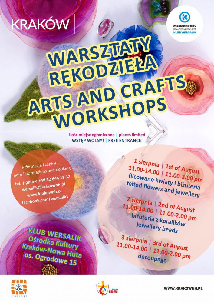 W ramach Œwiatowych Dni Młodzieży Klub Wersalik Oœrodka Kultury Kraków-Nowa Huta (os. Ogrodowe 15) zaprasza do udziału w warsztatach rękodzieła artystycznego. Zajęcia odbywać się będš w trzech grupach, każda z innej tematyki grupa I - tworzenie kwiatów i biżuterii, technika filcowania "na mokro" kolorowej wełenki czesankowej z merynosów hiszpańskich, grupa II - tworzenie biżuterii z koralików drucików oraz tiulu, organzy i atłasu, grupa III - ozdabianie drewnianych pudełek i innych przedmiotów metodš decoupage. Warsztaty poprowadzi Krystyna Drożdżowska – jubiler i twórca rękodzieła. Każda grupa liczyć będzie do 20 osób.