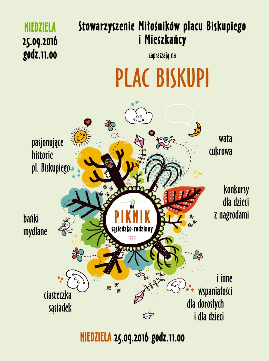 Stowarzyszenie mionikw Placu Biskupiego gorco zaprasza na III ssiedzko-rodzinny Piknik na placu Biskupim, ktry odbdzie si w niedziel 25.09.2016