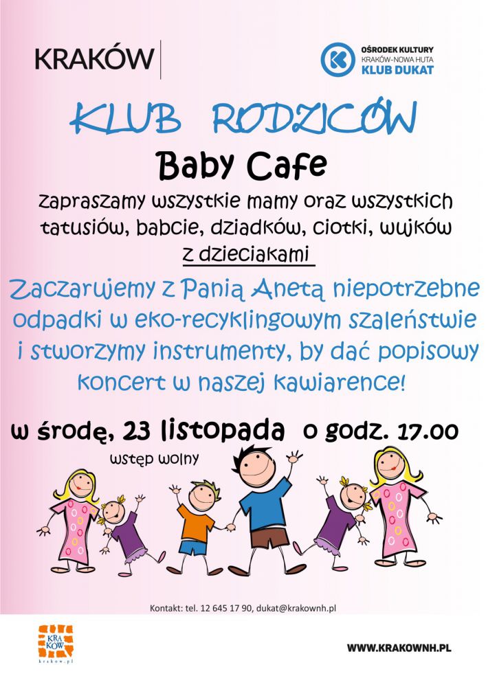 Klub Dukat Orodka Kultury Krakw-Nowa Huta (ul. Styczna 1) zaprasza 23 listopada w godz. 17.00-19.00 na spotkanie Baby Cafe - Wieczr z pracowni arteterapii. Bdzie to wsplne warsztatowe spotkanie rodzicw z dziemi ze specjalist w dziedzinie arteterapii, angaujce do wsplnej zabawy cae rodziny.