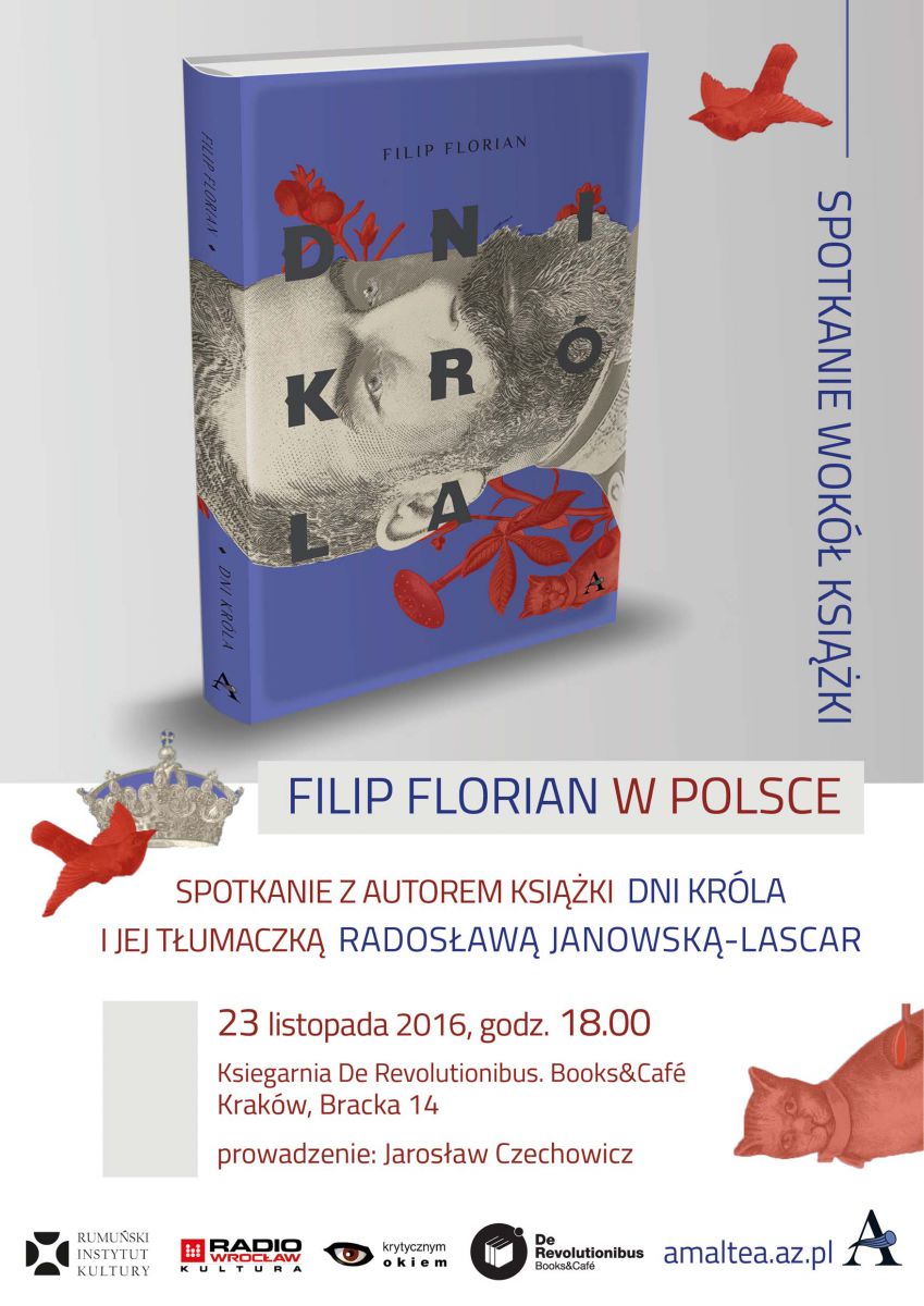 Rumuński Instytut Kultury i Wydawnictwo Amaltea serdecznie zapraszajš na spotkanie z Filipem Florianem, autorem powieci "Dni króla" i tłumaczkš Radosławš Janowskš-Lascar. Rozmowę poprowadzi Jarosław Czechowicz