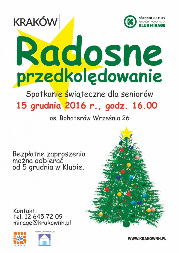 Œwięta Bożego Narodzenia to najbardziej uroczyste i wzruszajšce œwięta w naszej tradycji. Œwięta, na które wszyscy czekajš z utęsknieniem. Klub Mirage Oœrodka Kultury Kraków-Nowa Huta (os. Bohaterów Wrzeœnia 26) zaprasza wszystkich seniorów na uroczyste spotkanie œwišteczne w Klubie Seniora w czwartek 15 grudnia o godz. 16.00. W atmosferze ciepła i wzajemnej sympatii oraz przy dŸwiękach najpiękniejszych kolęd rozpocznie się ten cudowny œwišteczny czas. Radosne przedkolędowanie będzie okazjš, by złożyć sobie życzenia oraz skosztować tradycyjnych bożonarodzeniowych potraw. Zapraszajš Klub Mirage oraz Spółdzielnia Mieszkaniowa Mistrzejowice-Północ.