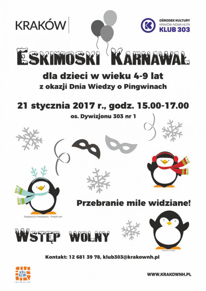 Z okazji Dnia Wiedzy o Pingwinach 21 stycznia w godz. 15.00-17.00 w Klubie 303 Orodka Kultury Krakw-Nowa Huta (os. Dywizjonu 303 nr 1) odbdzie si Eskimoski Karnawa. Na bal serdecznie zaproszamy dzieci w wieku od 4 do 9 lat. Podczas spotkania dzieci odtacz najduszy pingwinkowi taniec, przygotuj pingwinkowe maski oraz zbuduj eskimoskie igloo, w ktrym zamieszkaj pingwiny. Nie zabraknie te zimowych gier i zabaw.