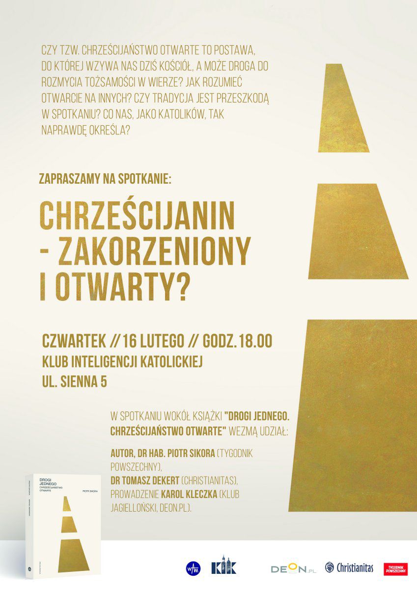 Zapraszamy na spotkanie wokół ksišżki "Drogi jednego. Chrzecijaństwo otwarte", w którym udział wezmš autor, dr hab. Piotr Sikora, teolog zwišzany z "Tygodnikiem Powszechnym" oraz dr Tomasz Dekert, religioznawca, członek redakcji "Christianitas". Spotkanie poprowadzi Karol Kleczka (Deon.pl, Klub Jagielloński).