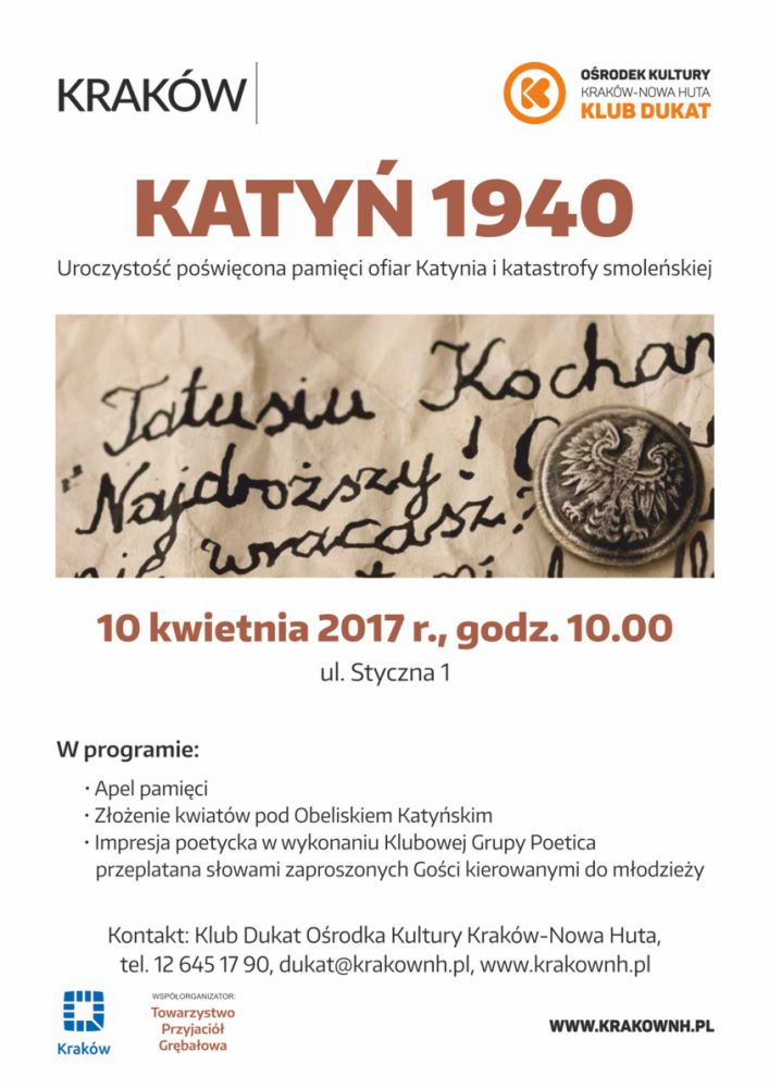10.04. o godz. 11.00 odbędzie się uroczysty apel poległych, złożenie kwiatów i zapalenie zniczy pod kamieniem katyńskim na terenie Klubu Dukat Orodka Kultury Kraków-Nowa Huta (ul. Styczna 1). Spotkanie uwietni program poetycki w wykonaniu Klubowej Grupy Poetica. W obchodach wezmš udział przedstawiciele Rady Dzielnicy XVII Wzgórza Krzesławickie, mieszkańcy Grębałowa i okolicy oraz młodzież ze szkół podstawowych i gimnazjalnych dzielnicy XVII z pocztami sztandarowymi. Słowa do młodzieży skierujš panowie Sławomir Pietrzyk i Maciej Miezian oraz kombatanci.