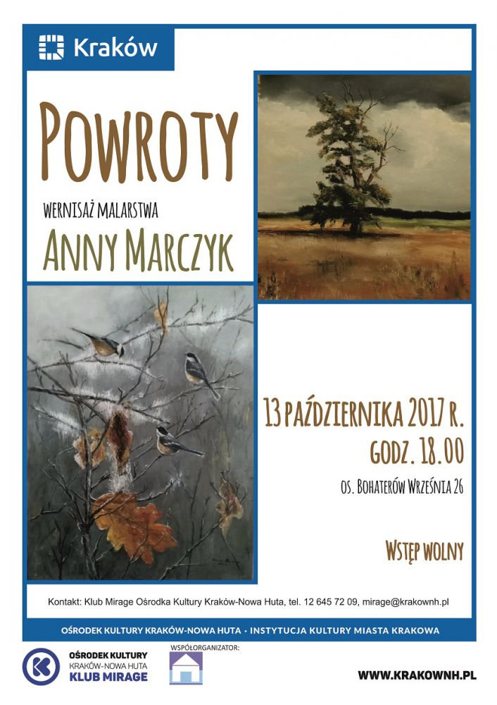 W padzierniku Galeria M Plus w Klubie Mirage Orodka Kultury Kraków-Nowa Huta (os. Bohaterów Wrzenia 26) zaprasza na wystawę znanej krakowskiej malarki Anny Marczyk. Wernisaż wystawy będzie miał miejsce w pištek 13 padziernika o godz. 18.00. Zainteresowania plastyczne towarzyszyły Annie Marczyk od dawna, ale poważne próby malarskie podjęła przed 10 lat malujšc w Klubie Paleta oraz w pracowni malarskiej przy Galerii Rękawka. Każda z tych prób, jak sama twierdzi, to jak wejcie do nowego wiata, gdzie potrzeba odwzorowania współgra z koniecznociš syntezy, znalezienia odpowiedniej techniki, faktury i barw. Białe płótno ustawione na sztalugach nosi w sobie widocznš zapowied obrazu. To ta zapowied prowadzi i wydobywa emocje, które tak mocno uzewnętrzniajš się w jej pracach. Ulubionš technikš Anny Marczyk jest olej, ale interesujš jš również techniki mieszane prowadzšce do wzbogacenia faktury jak i eksperymenty przestrzenne, a także akwarela i rysunek. Swoje prace prezentowała na szeciu wystawach indywidualnych i wielu zbiorowych. Wernisaż uwietni koncert gitarowy Piotra Pitali. Serdecznie zapraszamy. Wystawę można oglšdać do końca listopada br.