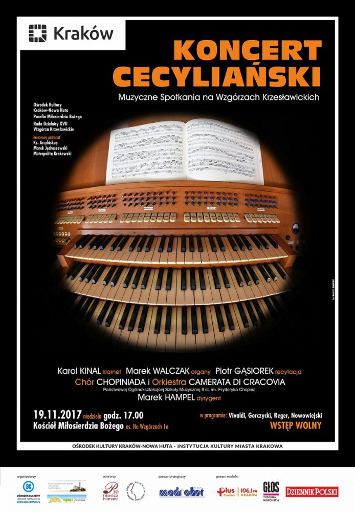 W niedzielę, 19 listopada 2017 r. o godz. 17.00 w kociele Miłosierdzia Bożego na Wzgórzach Krzesławickich odbędzie się Koncert Cecyliański w ramach cyklu Muzyczne Spotkania na Wzgórzach Krzesławickich. Wydarzenie wpisuje się w długoletniš tradycję organizowania koncertów ku czci więtej Cecylii - patronki muzyki sakralnej, piewu, chórów i organistów. Jednoczenie, organista i pomysłodawca cyklu - Marek Walczak pragnie podkrelić czynnym udziałem w koncercie, swojš dwudziestoletniš obecnoć w kociele na Wzgórzach Krzesławickich.