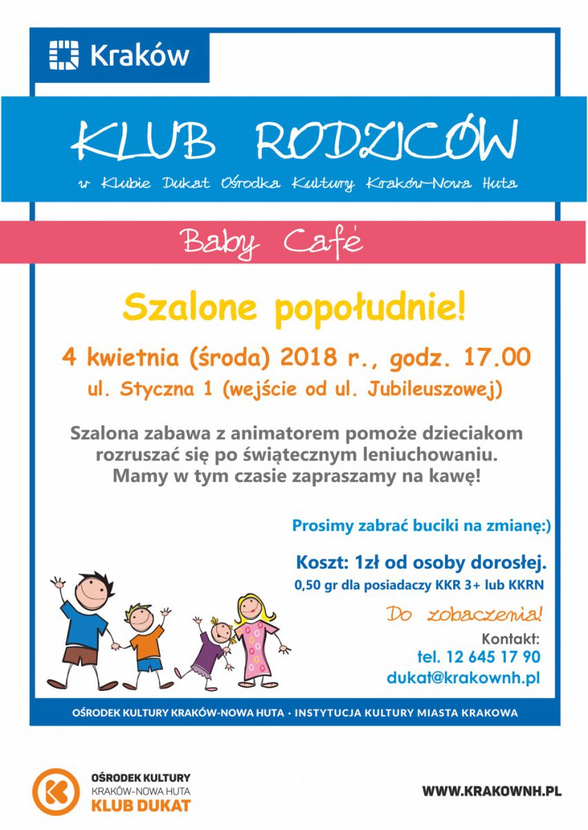 Klub Dukat Oœrodka Kultury Kraków-Nowa Huta (ul. Styczna 1) zaprasza w œrodę, 4 kwietnia w godz. 17.00-18.30 na zajęcia w ramach cyklu Baby Cafe. Szalone popołudnie to czas tańców, animacji i konkursów dla dzieci, a dla mam – okazja do spotkania przy kawie i spokojnej rozmowy. Wyœmienitš zabawę i dobre humory zapewni profesjonalny animator, który przeniesie milusińskich w magiczny œwiat beztroskich szaleństw! Zajęcia organizowane w ramach Klubu Rodziców.