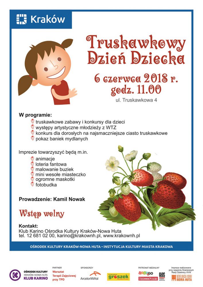 Klub Karino Oœrodka Kultury Kraków-Nowa Huta (ul. Truskawkowa 4) serdecznie zaprasza w œrodę 6 czerwca na godz. 11.00 dzieci, młodzież oraz dorosłych na Truskawkowy Dzień Dziecka. Na uczestników festynu czeka mnóstwo atrakcji, przygotowanych przez organizatorów, m.in. loteria fantowa, liczne konkursy, ciekawe zabawy, pokaz baniek mydlanych, żywe maskotki, dmuchane zabawki, fotobudka i wiele innych. Motywem przewodnim zabawy będš powszechnie lubiane przez tych małych i tych dużych owoce – truskawki. Każdemu chętnemu wymalujemy na twarzy wielkš truskawkę specjalnymi farbami ekologicznymi. Doroœli wykażš się zdolnoœciami kulinarnymi w konkursie na Najsmaczniejsze ciasto truskawkowe. Nie zabraknie też œwieżych owoców do spożycia dla uczestników. Sponsorem imprezy jest ArcelorMittal Poland S.A. oraz Sklep Groszek. Impreza realizowana przy wsparciu Rady Dzielnicy XVIII Nowa Huta.