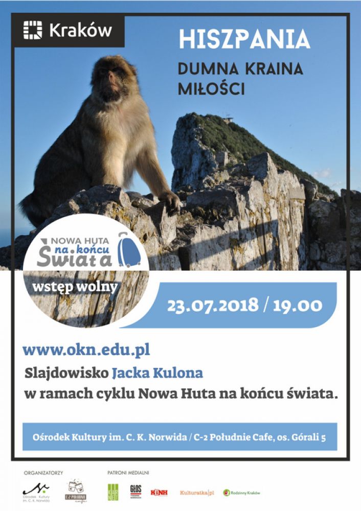 Slajdowisko Jacka Kulona - socjologa, podróżnika, pisarza, wielkiego miłonika i pasjonata Hiszpanii, autora ksišżki pt. "Hiszpania - dumna kraina miłoci" w ramach cyklu Nowa Huta na końcu wiata. Wstęp wolny.