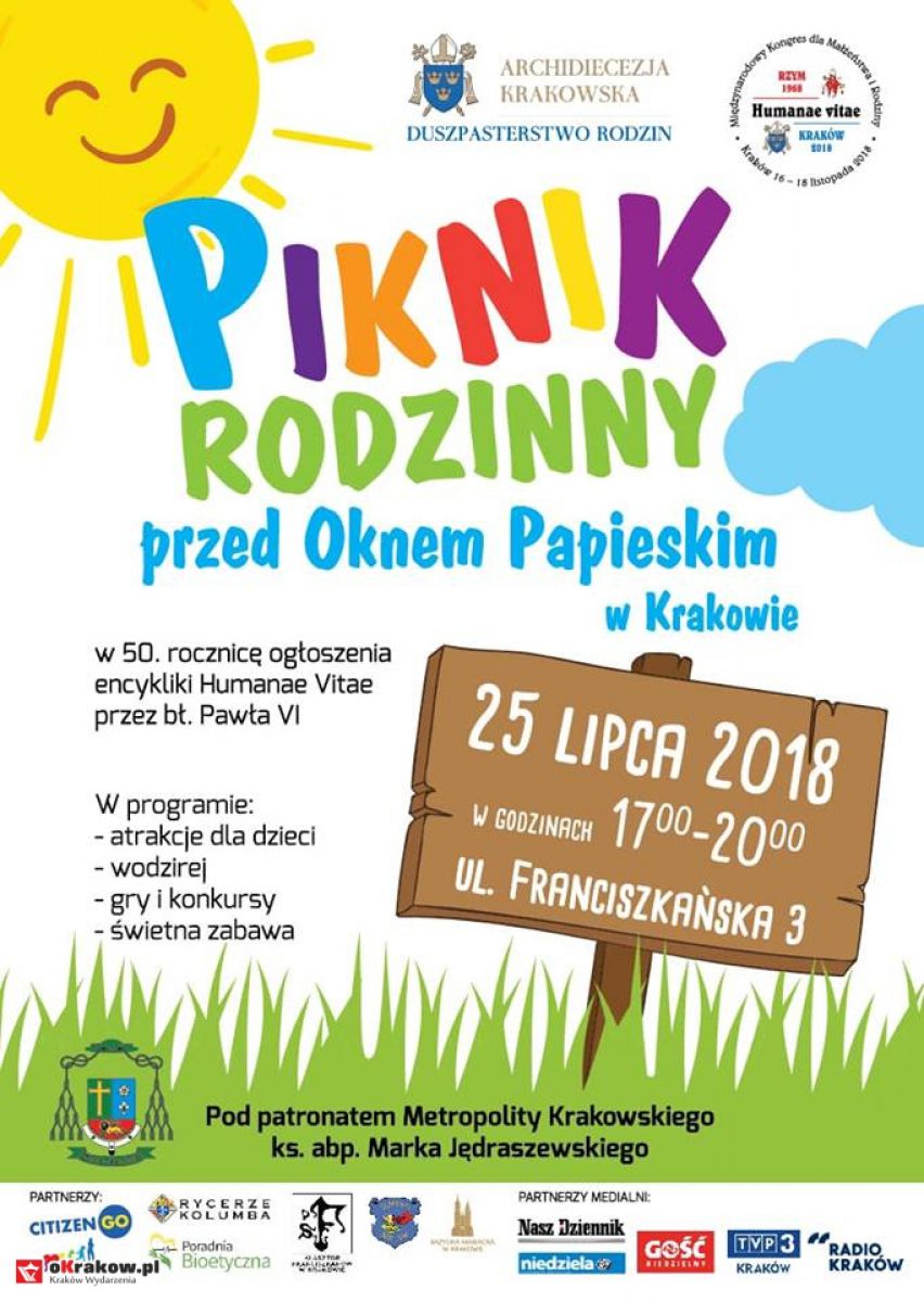 Archidiecezja Krakowska, Duszpasterstwo Rodzin zapraszaj 25 lipca 2018 r. na Piknik Rodzinny przed Oknem Papieskim w Krakowie.