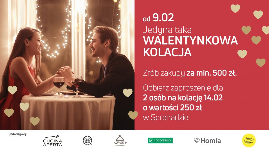 Już od najbliższej soboty, klienci Centrum Serenada robišc zakupy za co najmniej 500 zł, będš mogli otrzymać zaproszenie dla dwóch osób na specjalnš, walentynkowš kolację, o wartoci 250 zł. Spotkanie odbędzie się 14 lutego o godzinie 19.00 w Serenadzie.
