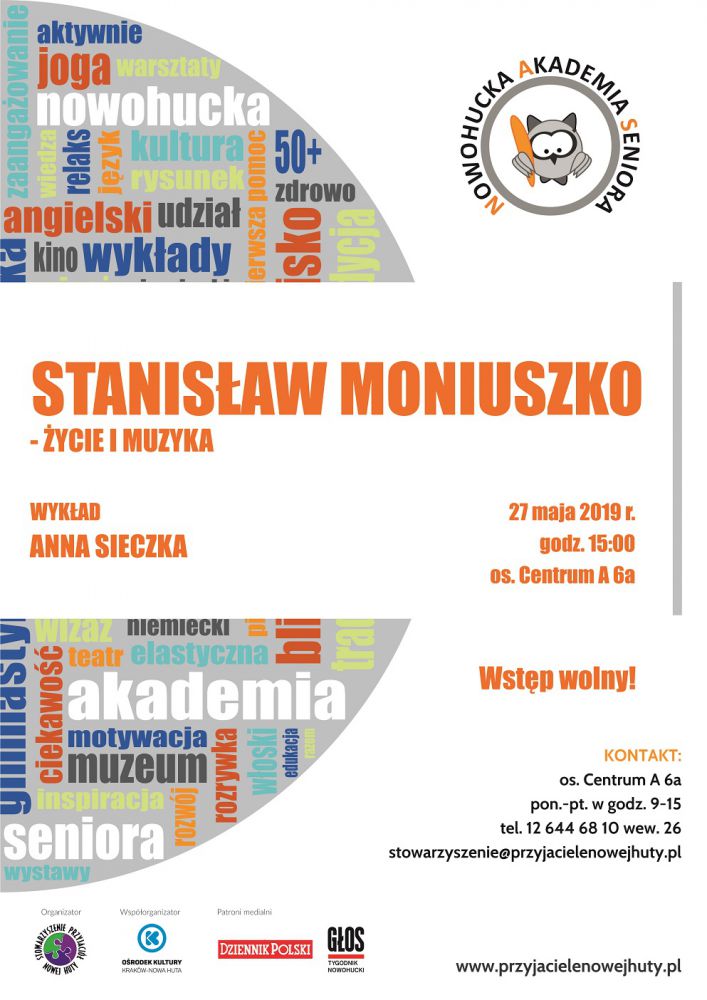 Nowohucka Akademia Seniora (os. Centrum A 6a) w ustanowionym przez Sejm Roku Stanisława Moniuszki zaprasza 27.05 o godz. 15.00 na wykład powięcony życiu i muzyce artysty, który wygłosi Anna Sieczka. Artysta był człowiekiem nietuzinkowym. Nie tylko kompozytorem ponad 250 pieni, kilkunastu oper, operetek i baletów, ale także poliglotš, podróżnikiem i