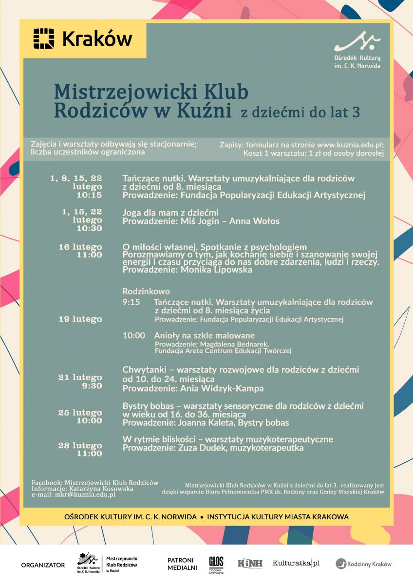 Wszystkie zajęcia odbywajš się stacjonarnie Klub Kunia Orodka Kultury im. C. K. Norwida, os. Złotego Wieku 14. Obowišzujš zapisy na stronie www.kuznia.edu.pl, zakładka Mistrzejowicki Klub Rodziców. Formularz zapisów będzie dostępny od 27.01.2022 r., od godziny 11:00.