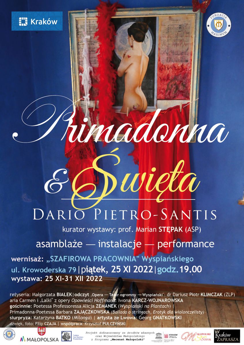 Organizatorzy Fundacja „Maximum” i Fundacja Dom Stanisława Wyspiańskiego w Krakowie oraz Małopolski Salon Sztuk zapraszają do Szafirowej Pracowni Stanisława Wyspiańskiego na niezwykłą wystawę „Primadonna & Święta” nawiązującą do starożytnej koncepcji Świętej Ladacznicy oraz idei wybitnego teoretyka i praktyka teatru, założyciela „Teatru Laboratorium” Jerzego Grotowskiego, który podzielił aktorów na świętych i ladacznice.