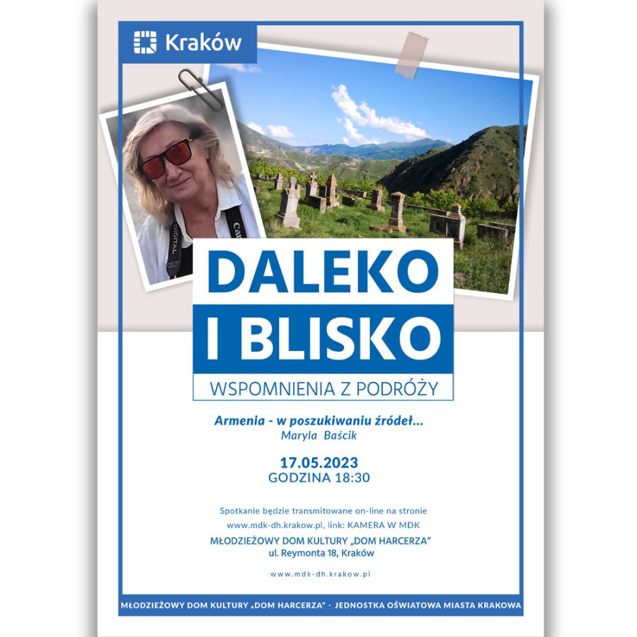 Cykl „Daleko i blisko” to niezwykłe spotkania z podróżnikami, fotografami, osobami ciekawymi świata i ludzi. Zapraszamy osoby, które chcą podzielić się swoimi wspomnieniami z podróży. Prezentujemy zdjęcia z wypraw, a zaproszeni prelegenci wzbogacają te pokazy swoimi opowiadaniami. Na naszych spotkaniach nie brakuje również doznań kulinarnych, gdyż opowieści są dodatkowo okraszone poczęstunkiem związanym z omawianym miejscem czy regionem. Poczęstunek ten sponsoruje Dzielnica V – Krowodrza.