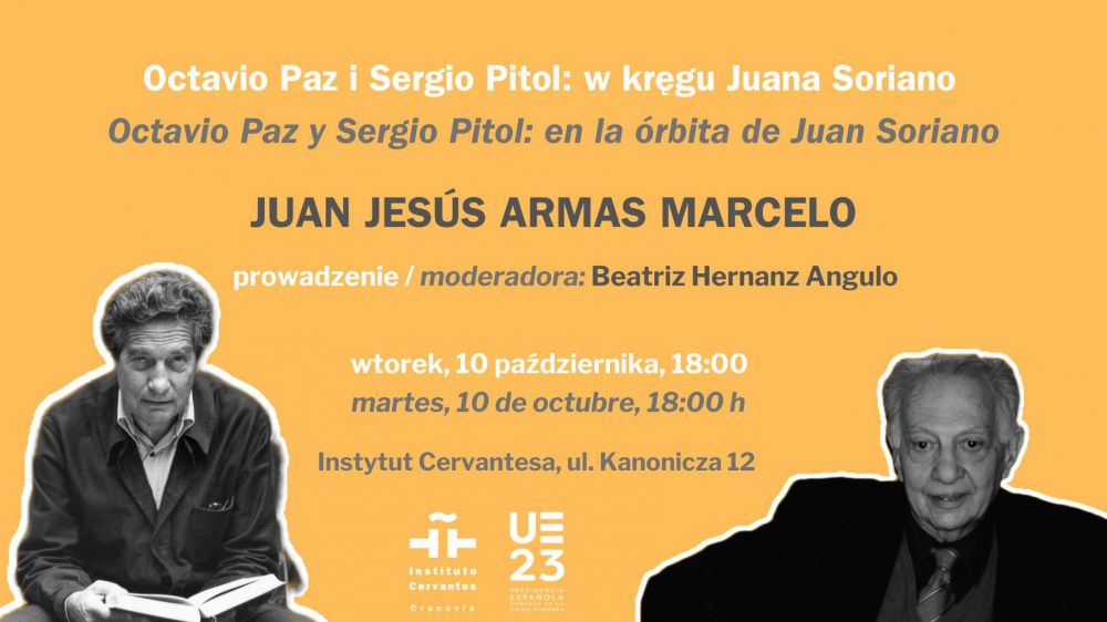 W ramach wydarzeń towarzyszących wystawie „Księżyc i bestiarium Juana Soriano” Instytut Cervantesa w Krakowie serdecznie zaprasza na spotkanie z hiszpańskim dziennikarzem i pisarzem Juanem Jesúsem Armasem Marcelo, który opowie o intelektualnych i życiowych powinowactwach łączących meksykańskiego artystę z dwoma wybitnymi twórcami jego epoki: Octavio Pazem i Sergio Pitolem.