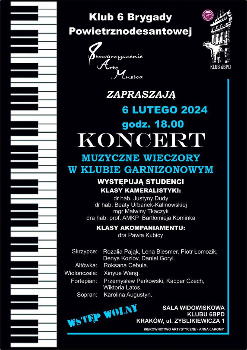 06 lutego br., o godz. 18.00 odbędzie się koncert z cyklu "Muzyczne Wieczory w Klubie Garnizonowym",
