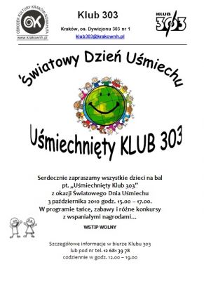 Na bal z okazji wiatowego Dnia Umiechu zaprasza Klub 303 Orodka Kultury Krakw-Nowa Huta. W programie imprezy: wsplne tace, zabawy, konkursy z nagrodami m.in. konkurs na najpikniejszy umiech czy bajkowe zgadywanki.