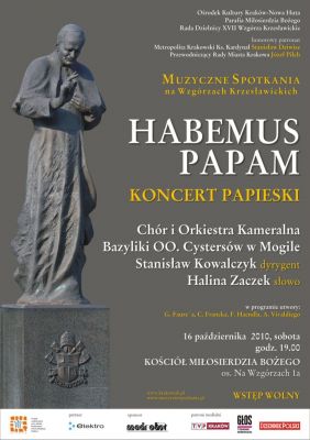 Oœrodek Kultury Kraków-Nowa Huta, Parafia Miłosierdzia Bożego oraz Rada Dzielnicy XVII Wzgórza Krzesławickie zapraszajš na kolejny koncert z cyklu Muzyczne Spotkania na Wzgórzach Krzesławickich. W programie Koncertu Papieskiego usłyszymy utwory: G. Faure´a, C. Francka, F. Haendla oraz A. Vivaldiego. Poezję Karola Wojtyły czytać będzie Halina Zaczek.