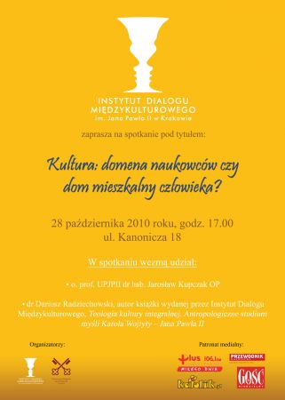 Odbędzie się ono 28. padziernika 2010 o godzinie 17:00, w siedzibie Instytutu przy ulicy Kanoniczej 18. Temat naszej dyskusji nawišzuje do przemówienia Jana Pawła II w Leuven w 1985 r. W spotkaniu wemie udział o. prof. UPJPII dr hab. Jarosław Kupczak OP wraz z autorem ksišżki wydanej przez Instytut Dialogu Międzykulturowego, Teologia kultury integralnej. Antropologiczne studium myli Karola Wojtyły Jana Pawła II, Panem dr Dariuszem Radziechowskim. Ksišżka podejmuje całociowš analizę teologii kultury w oparciu o myl i nauczanie Karola Wojtyły Jana Pawła II. Wskazuje na antropologiczne podstawy adekwatnej dyskusji o kulturze, ukazujšc człowieka jako tego, który żyje kulturš i żyje poprzez kulturę zarówno w wymiarze indywidualnym, jak i wspólnotowym. Człowieka, który ma możliwoć tworzenia nie tylko piękna dzieł zewnętrznych, ale i piękna własnej duszy. Ksišżka stara się także ukazać adekwatnš relację kultury i religii, oraz wskazuje na stan współczesnej kultury, jej kryzys, a zarazem możliwe kierunki rozwoju.