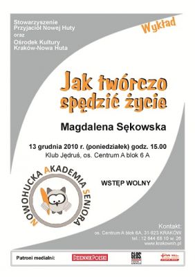 To już drugi wykład Magdaleny Sękowskiej w ramach Nowohuckiej Akademii Seniora. Na kolejnej prelekcji z dziedziny psychologii zaprezentuje i doradzi ona, w jaki sposób twórczo spędzić życie. Zapraszajš: Stowarzyszenie Przyjaciół Nowej Huty i Oœrodek Kultury Kraków-Nowa Huta.