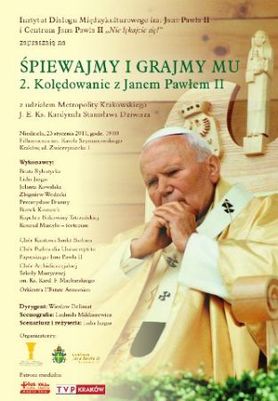 który odbędzie się w Filharmonii Krakowskiej 23 stycznia 2011 r. o godzinie 19. Koncert uwietni swojš obecnociš ks. kard. Stanisław Dziwisz. Kolędy i pastorałki zapiewajš: Beata Rybotycka, Lidia Jazgar, Jolanta Kowalska, Zbigniew Wodecki, Przemysław Branny, a z Bukowiny Tatrzańskiej przybędzie nasz góralski goć - Bartek Koszarek. Całoć poprowadzi Lidia Jazgar, która jest także autorkš scenariusza i reżyserem koncertu. Artystom towarzyszyć będš chóry: Kantorei Sankt Barbara, Chór Psalmodia Uniwersytetu Papieskiego Jana Pawła II oraz Chór Archidiecezjalnej Szkoły Muzycznej im. Ks. Kard. F. Macharskiego, a także Orkiestra L'Estate Armonico. Orkiestrę i chóry poprowadzi Wiesław Delimat. Koncert jest nawišzaniem do starego zwyczaju kolędowania, które było obecne także w Watykanie podczas Pontyfikatu Jana Pawła II. Kolędowanie oznacza, że publicznoć będzie mogła piewać znane wszystkim kolędy razem z artystami.