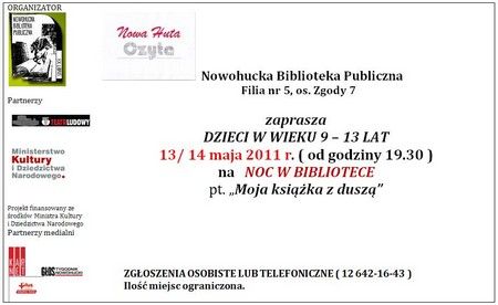 Filia nr 5, os. Zgody 7 zaplanowaa z 13/14 maja 2011 r. kolejn ju Noc w Bibliotece pt. Moja ksika z dusz . W czasie spotkania poprzez przeprowadzone konkursy, zajcia animacyjno-czytelnicze ukazane zostan moliwoci twrczego wykorzystania tekstu literackiego. Przewidziano rwnie gr terenow, ktrej celem bdzie odkrycie kufra z ksikami.