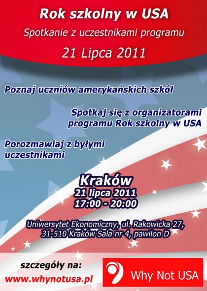 Wyjazd do Stanów Zjednoczonych to poważna decyzja dla każdego młodego człowieka. Niejednokrotnie to pierwsza tak radykalna zmiana w życiu nie tylko ucznia, ale także jego rodziców. Firma Why Not USA, która specjalizuje się w tym programie - bardzo dobrze zdaje sobie z tego sprawę i dlatego zaprasza wszystkich zainteresowanych na spotkanie.