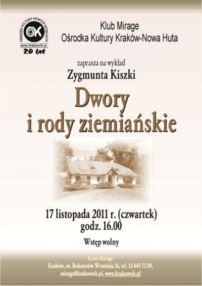 Serdecznie zapraszamy do Klubu Mirage Orodka Kultury Kraków-Nowa HUta na prelekcję Dwory i rody ziemiańskie Nowej Huty. Wykład dr Zygmunta Kiszki przybliży historię dworów nowohuckich i zamieszkujšcych je rodów ziemiańskich.
