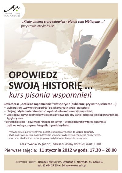 Jeli chcesz ocalić od zapomnienia własne życie (publiczne, prywatne, sekretne ...) zapraszamy na kurs przeznaczony dla osób dorosłych. Wybierz się w wewnętrznš podróż po zakamarkach swojej przeszłoci, obejrzyj z dystansu teraniejszoć, wyobrażajšc sobie różne wersje przyszłoci; uporzšdkuj indywidualne dowiadczenia życiowe tak, aby janiej zobaczyć ich niepowtarzalnoć i głębszy sens, utrwal dla siebie i być może również innych własnš biografię w formie nagrania bšd we wzbogaconym w fotografie i rysunki wydruku.