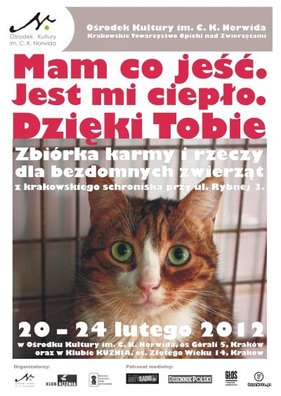 Zbiórka karmy i rzeczy dla zwierzšt z krakowskiego schroniska to nie pierwsza tego typu akcja organizowana przez Oœrodek Kultury im. C.K.Norwida. Instytucja od kilku lat współpracuje z Krakowskim Towarzystwem Opieki nad Zwierzętami organizujšc cyklicznie akcje adopcyjne kotów z krakowskiego Schroniska, podczas którychrównież zbierana jest karma dla kotów i psów oraz koce i kołdry.