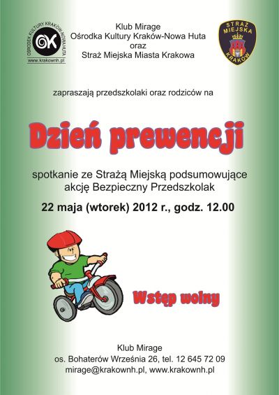 Klub Mirage Oœrodka Kultury Kraków-Nowa Huta (os. Bohaterów Wrzeœnia 26) zaprasza na ostatnie zajęcia w ramach projektu Bezpieczny przedszkolak, które odbędzie się 22 maja 2012 r. (wtorek) o godz. 12.00.