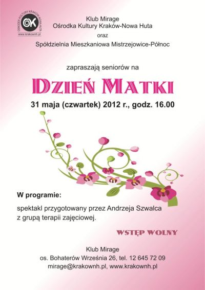 Tradycyjna impreza w Klubie Mirage Orodka Kultury Krakw-Nowa Huta z okazji Dnia Matki dla seniorw, ktr uwietni spektakl przygotowany przez Andrzeja Szwalca z grup terapii zajciowej. Wsporganizatorem imprezy jest Spdzielnia Mieszkaniowa Mistrzejowice-Pnoc.