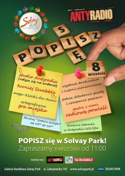 Co należy zrobić? Między 3 a 7 wrzenia w programie Godziny Szczytu między 13:00 a 16:00 na antenie Antyradia 101,3 FM na słuchaczy czeka codziennie inna łamigłówka, zwišzana ze słowotwórstwem i ortografiš. W poniedziałek będš oni musieli ułożyć jak najdłuższš bajkę, jedynie z wyrazów rozpoczynajšcych się na podanš literę. We wtorek z liter podanego długiego wyrazu trzeba będzie wymylić jak najwięcej innych samodzielnych wyrazów. roda to dzień tasiemca słuchacze będš zmagać się ze stworzeniem jak najdłuższej historii z wyrazów, których pierwsza litera, ma być ostatniš literš wyrazu poprzedzajšcego. Czwartego dnia konkursu skrajnie odległe od siebie wyrazy trzeba będzie połšczyć wyrazami- skojarzeniami, których musi być 15. Ostatniego dnia na antenie odczytywane będzie dyktando, a słuchacze na żywo będš tłumaczyć jak dany wyraz należy napisać. Ten słuchacz który odpowie poprawnie przechodzi do następnego etapu. Codziennie do Wielkiego Turnieju gry w Scrabble, któremu patronuje Mattel, będš wybierane dwie najlepsze osoby. 8 wrzenia o godzinie 14 na terenie Solvay Park dziesięciu półfinalistów, pod opiekš przedstawicieli Polskiej Federacji Scrabble, będzie toczyło literowe potyczki. Dwóch finalistów rozegra swojš partię na wielkiej, półtorametrowej planszy Scrabble. Pomagać im będzie mogła publicznoć i przyjaciele, a wszyscy uczestnicy otrzymajš wielkie paczki z nagrodami.
