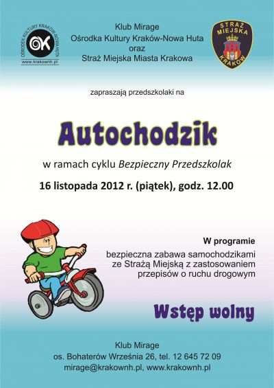Klub Mirage Oœrodka Kultury Kraków-Nowa Huta (os. Bohaterów Wrzeœnia 26) zaprasza 16 listopada 2012 r. o godz. 11.30 na kolejne spotkanie z cyklu Bezpieczny przedszkolak.
