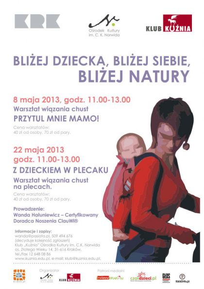 Do dyspozycji uczestników warsztatu chusty i lalki treningowe. Możliwość wypożyczenia chusty po warsztacie.
