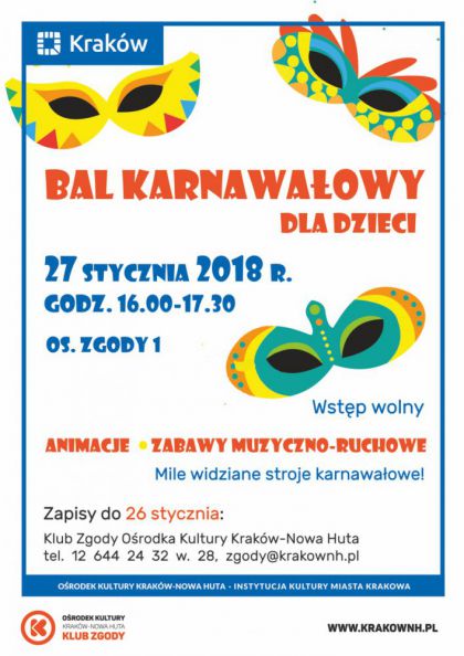 Klub Zgody Ośrodka Kultury Kraków- Nowa Huta (os. Zgody 1) zaprasza w sobotę 27 stycznia w godz. 16.00-17.30 na karnawałowy bal dla dzieci. Podczas imprezy w Klubie Zgody dzieci będą mogły wziąć udział w zabawach muzyczno-ruchowych, plastycznych i integracyjnych. Zabawy prowadzone będą przez animatorów.