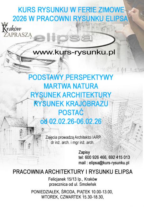 Kurs rysunku Kraków ferie zimowe 2026 02.02-06.02.26 5 DNI PO 3 GODZ. ZEGAR.