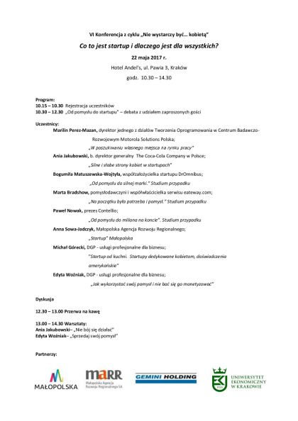 Kiedy pracowalimy nad tematem VI Konferencji Nie wystarczy by kobiet i pada propozycja, by powici j startupom, nasze zdania byy podzielone. Bo czym jest startup? Biznesem ze sformalizowan struktur? Pomysem na biznes? Wykorzystaniem luki na rynku? Odpowiadajcym na potrzeby wiatowych trendw pomysem na realizacj marze? A moe zwyczajnie mod? Definicji startupw jest oczywicie wiele, modeli ich tworzenia i prowadzenia jeszcze wicej. Cho temat ten doczeka si ju wielu publikacji naukowych i konferencji, to jednak cigle bywa le rozumiany. Bo czy startup musi by zbudowany na nowych technologiach? A moe nowe technologie powinny by tylko narzdziem do stworzenia produktu albo usugi, ktra bdzie w stanie konkurowa na rynku? Pyta byo jeszcze wicej. Postanowilimy zada je naszym prelegentom jeszcze raz, poniewa jestemy pewni, e w gszczu doniesie na temat tej brany, na niektre cigle brakuje odpowiedzi. Cigle te istnieje potrzeba edukowania w tym zakresie. Szczeglnie kobiet, ktre, jak si wydaje, a potwierdzaj to badania, unikaj angaowania si w takie przedsiwzicia.